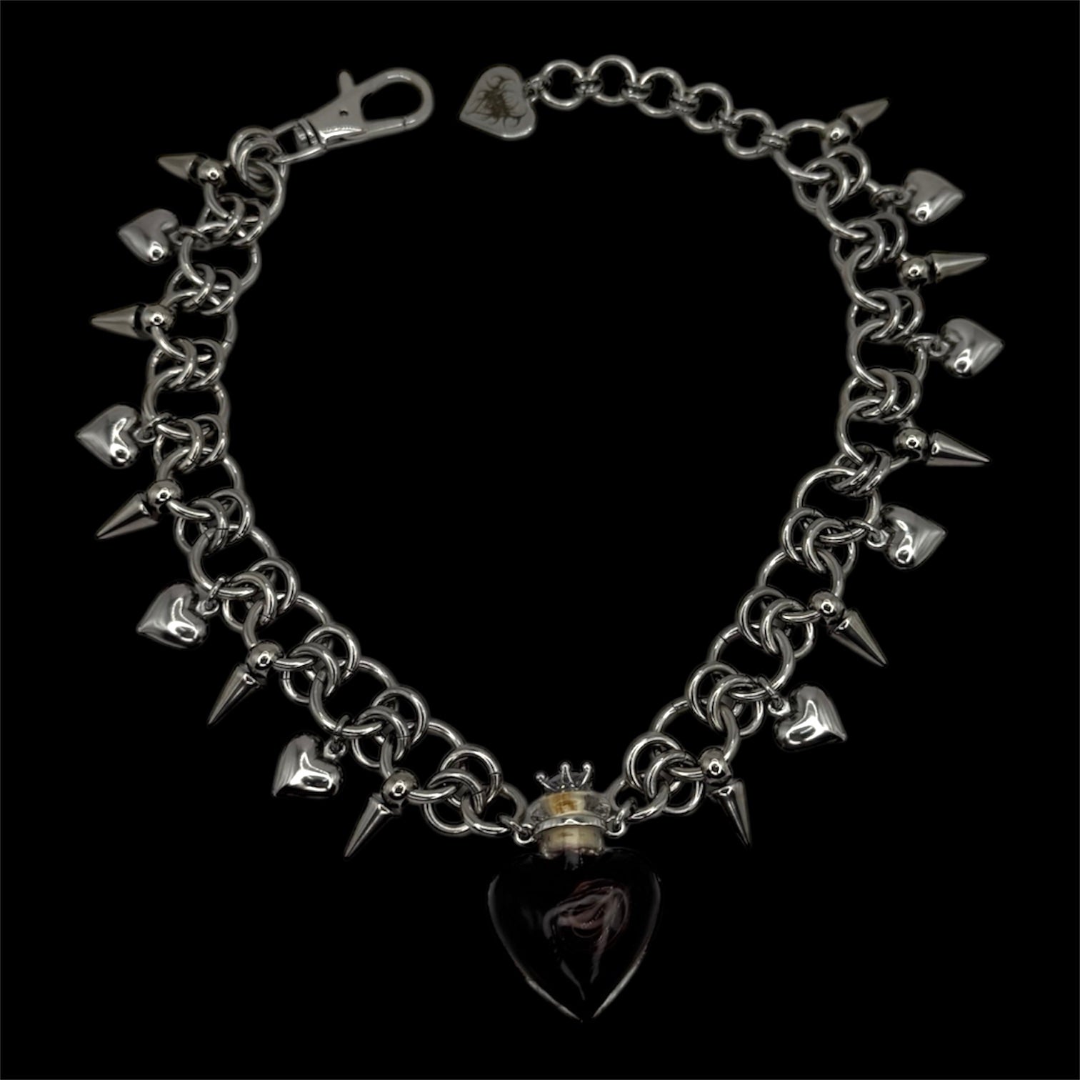 DETAILS: 100% Stainless steel chain with glass vial pendant with fake blood and steel pendants.
